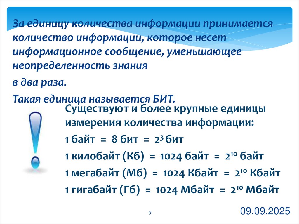 1 килобайт (Кб) = 1024 байт = 210 байт