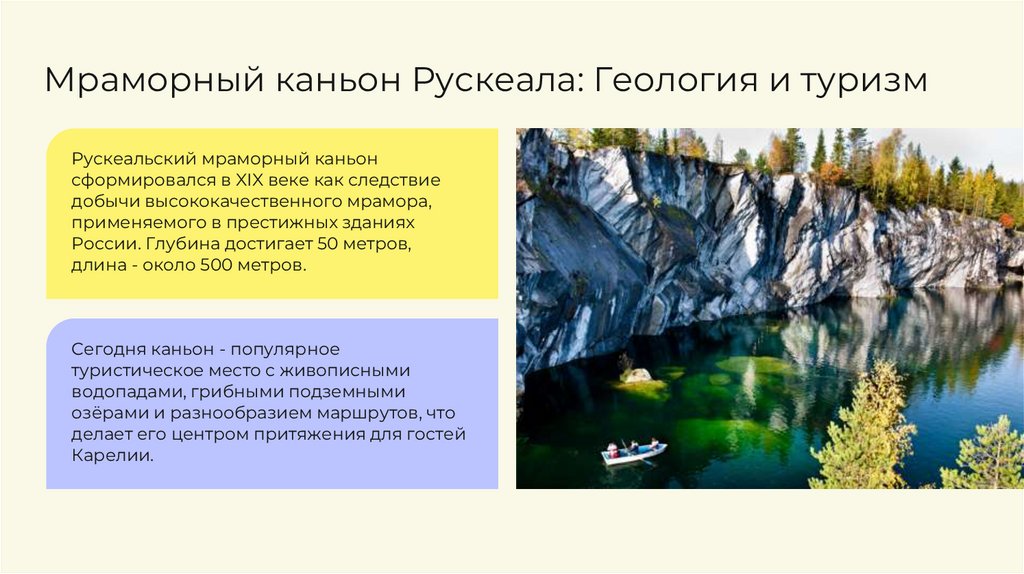 Мраморный каньон Рускеала: Геология и туризмРускеальский мраморный каньон