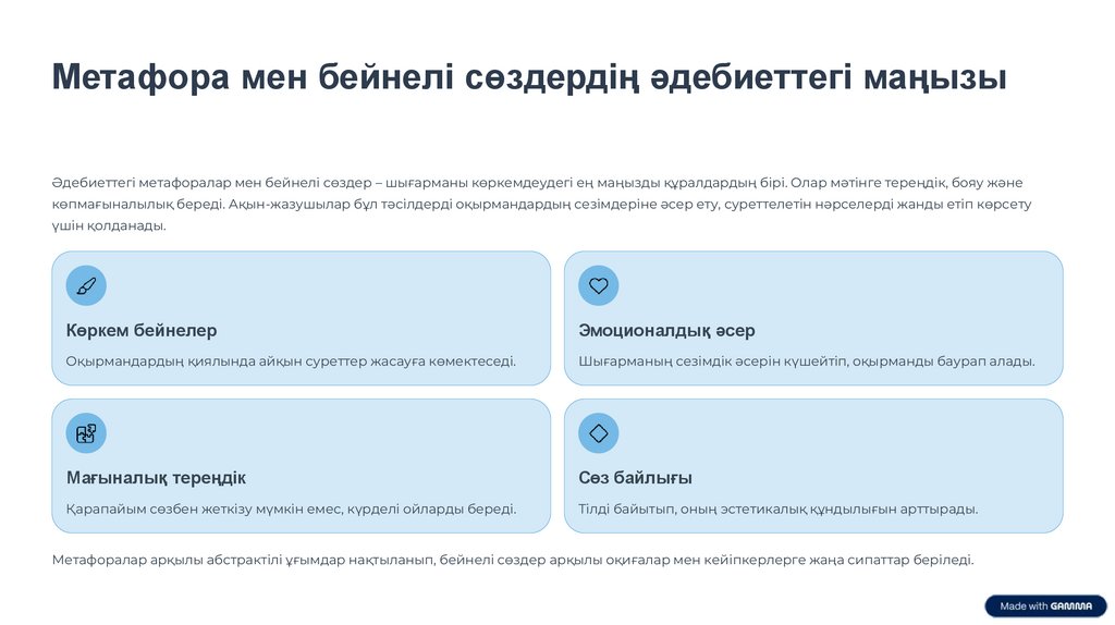 Метафора мен бейнелі сөздердің әдебиеттегі маңызыӘдебиеттегі метафоралар мен бейнелі сөздер – шығарманы көркемдеудегі ең маңызды құралдардың бірі. Олар мәтінге тереңдік, бояу және