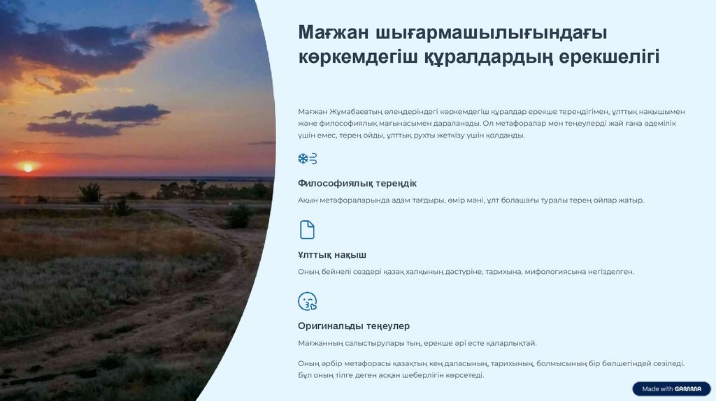және философиялық мағынасымен дараланады. Ол метафоралар мен теңеулерді жай ғана әдемілік