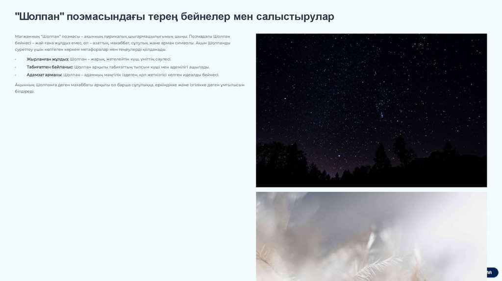 "Шолпан" поэмасындағы терең бейнелер мен салыстыруларМағжанның "Шолпан" поэмасы – ақынның лирикалық шығармашылығының шыңы. Поэмадағы Шолпан