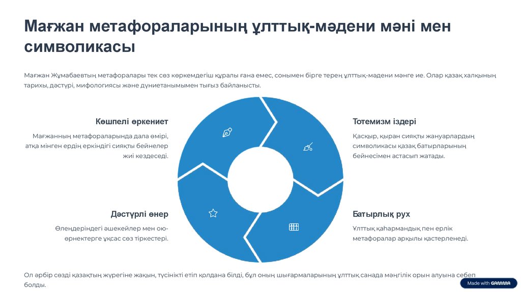 Мағжан Жұмабаевтың метафоралары тек сөз көркемдегіш құралы ғана емес, сонымен бірге терең ұлттық-мәдени мәнге ие. Олар қазақ халқының