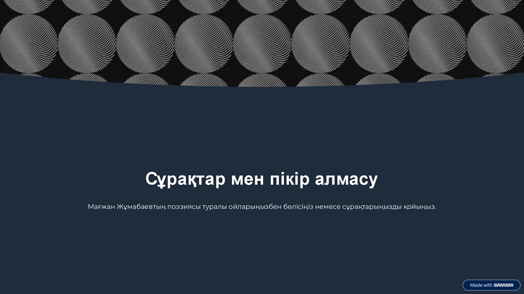 Сұрақтар мен пікір алмасуМағжан Жұмабаевтың поэзиясы туралы ойларыңызбен бөлісіңіз немесе сұрақтарыңызды қойыңыз.