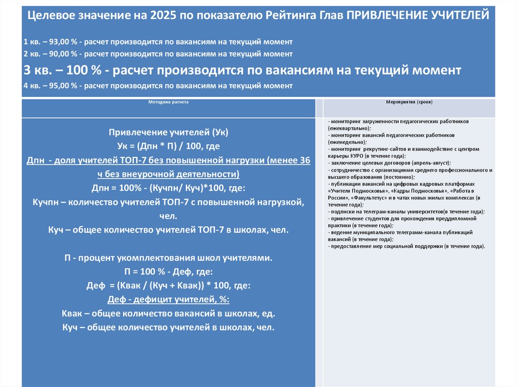 Целевое значение на 2025 по показателю Рейтинга Глав ПРИВЛЕЧЕНИЕ УЧИТЕЛЕЙ1 кв. – 93,00 % - расчет производится по вакансиям на текущий момент