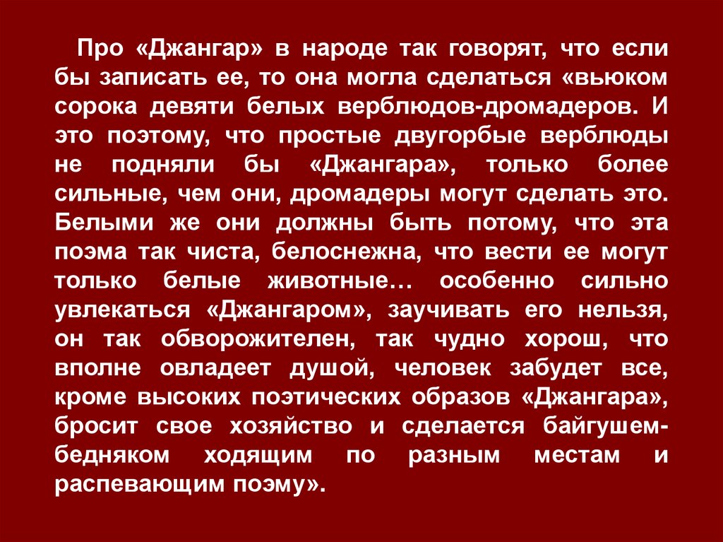 Про «Джангар» в народе так говорят, что еслибы записать ее, то она могла сделаться «вьюком