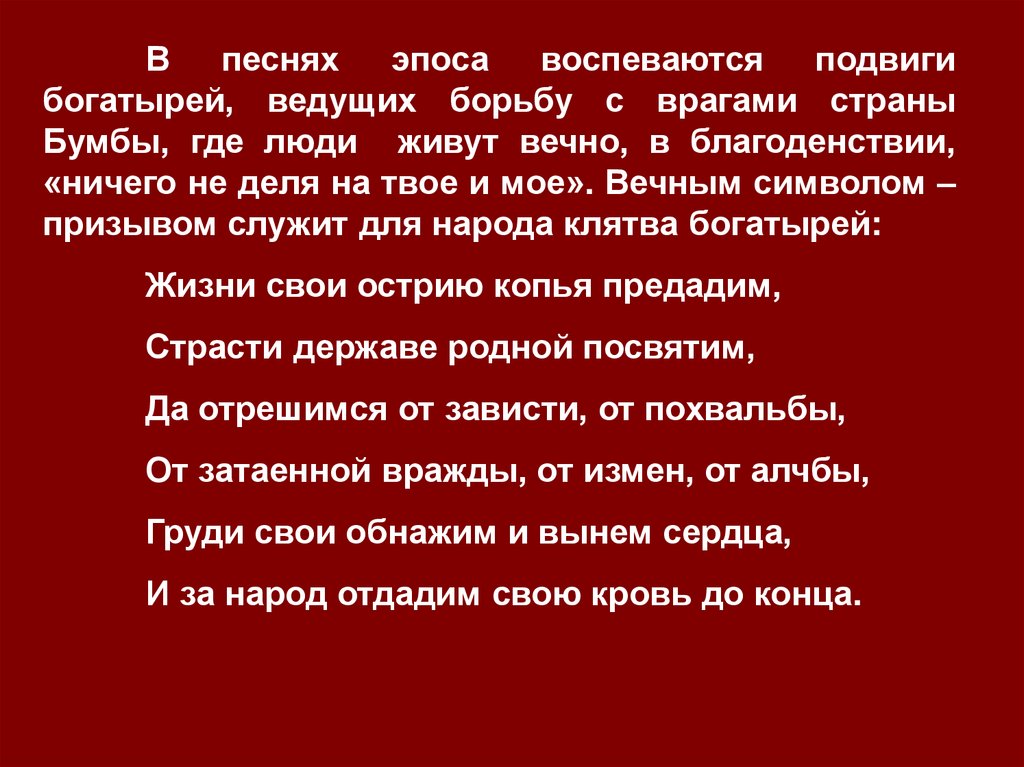 победах над несметными врагами, о Бумбе, стране бессмертия.