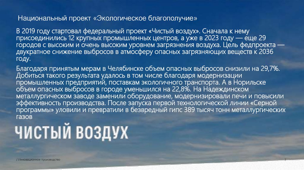 Национальный проект «Экологическое благополучие»В 2019 году стартовал федеральный проект «Чистый воздух». Сначала к нему