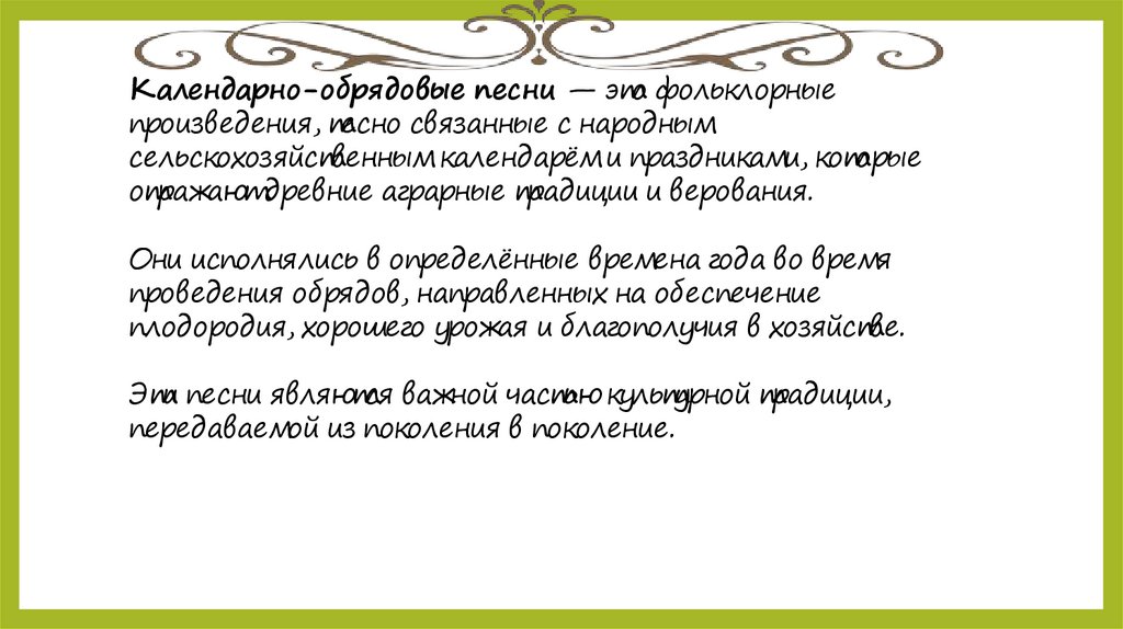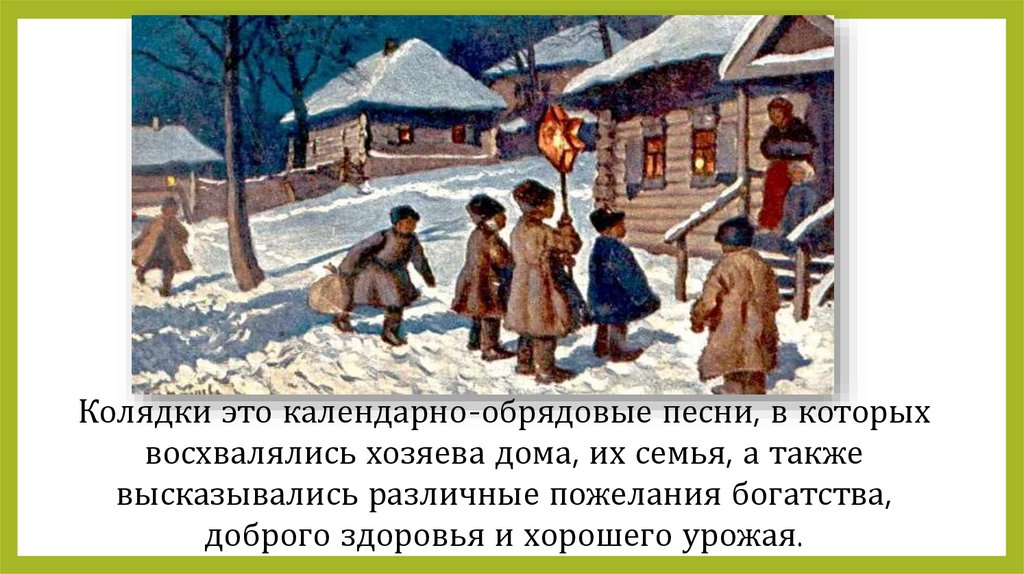 Колядки это календарно-обрядовые песни, в которыхвосхвалялись хозяева дома, их семья, а также