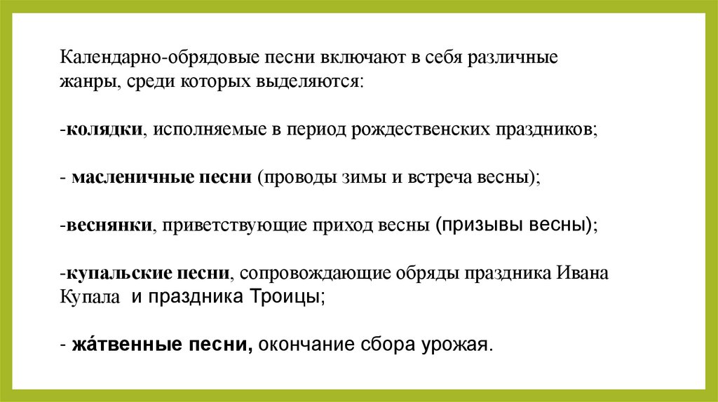Календарно-обрядовые песни включают в себя различныежанры, среди которых выделяются:
