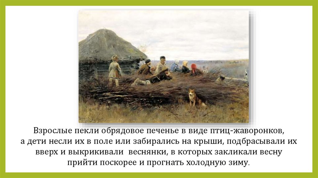 Взрослые пекли обрядовое печенье в виде птиц-жаворонков,а дети несли их в поле или забирались на крыши, подбрасывали их
