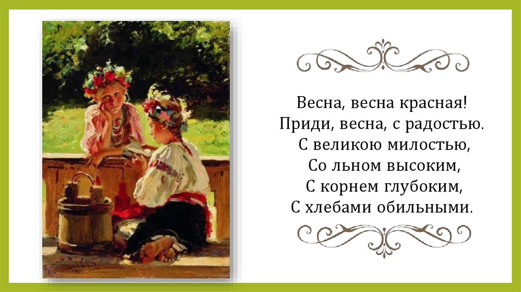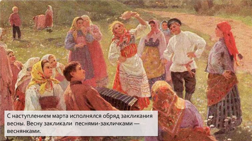 С наступлением марта исполнялся обряд закликаниявесны. Весну закликали песнями-закличками —