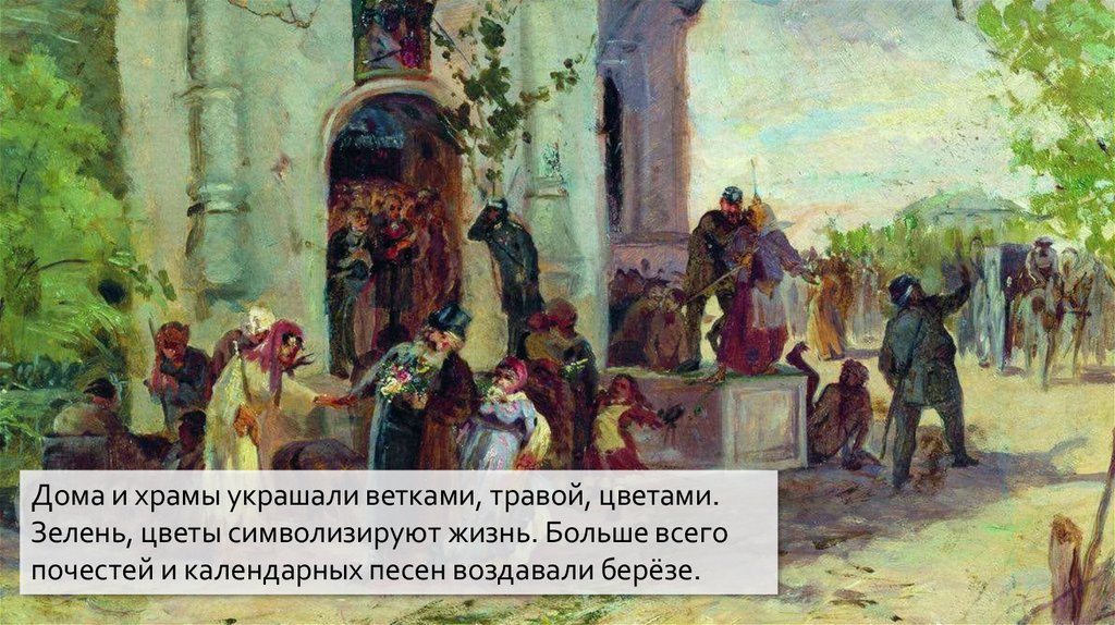 Дома и храмы украшали ветками, травой, цветами.Зелень, цветы символизируют жизнь. Больше всего