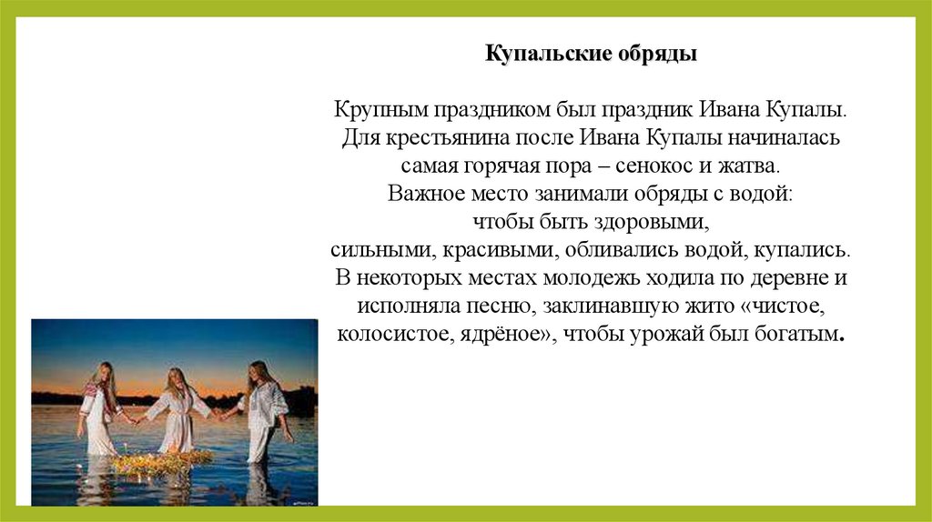 Купальские обрядыКрупным праздником был праздник Ивана Купалы.