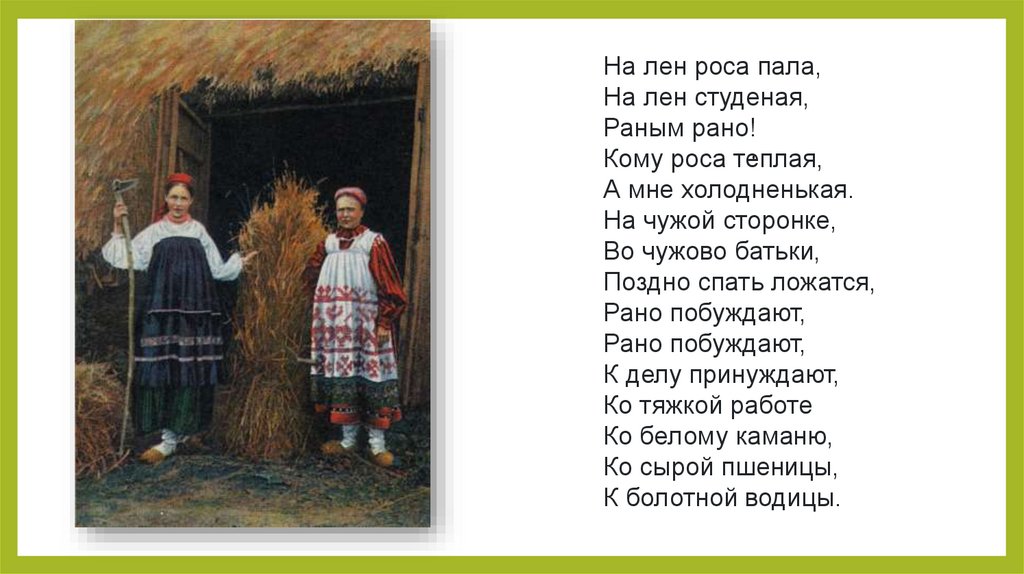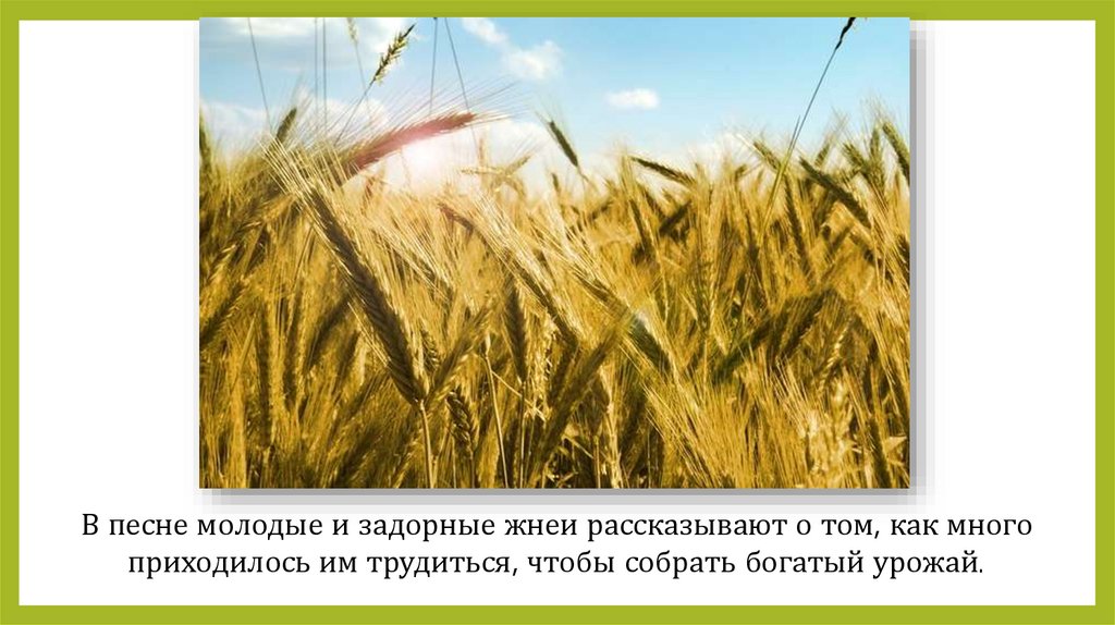 В песне молодые и задорные жнеи рассказывают о том, как многоприходилось им трудиться, чтобы собрать богатый урожай.