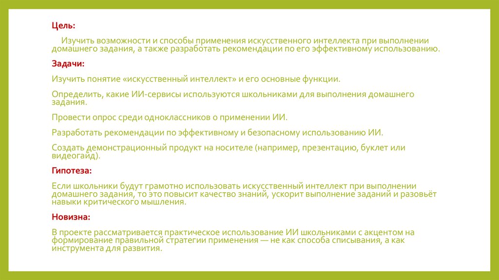 • В ходе работы над проектом была рассмотрена актуальная для современного образования тема— использование искусственного интеллекта (ИИ) как помощника в выполнении домашнего