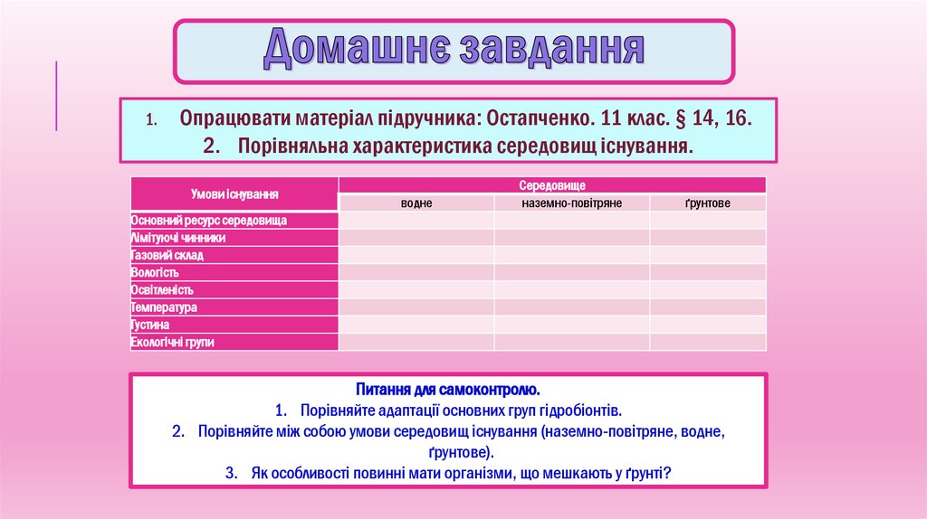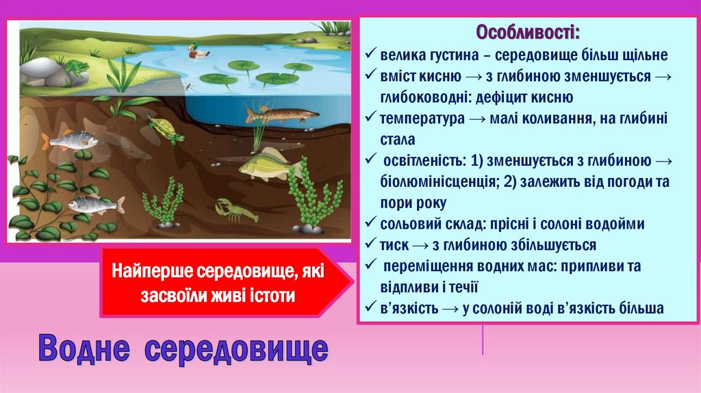 2. Порівняйте між собою умови середовищ існування (наземно-повітряне, водне,