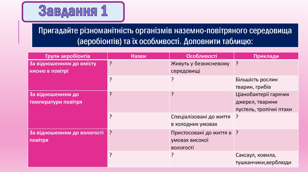 Пригадайте різноманітність організмів наземно-повітряного середовища(аеробіонтів) та їх особливості. Доповнити таблицю: