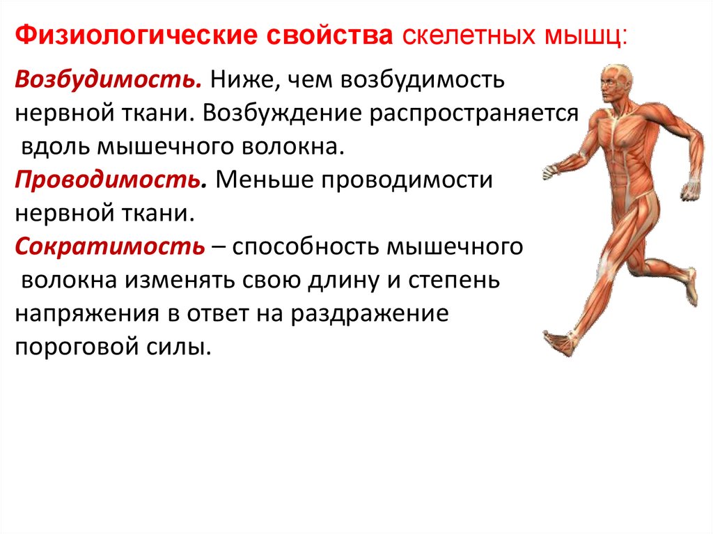 Физиологические свойства скелетных мышц:Возбудимость. Ниже, чем возбудимость