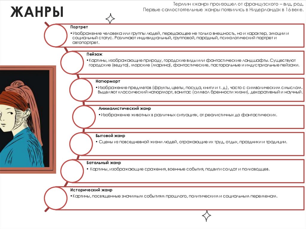 Термин «жанр» произошел от французского – вид, род.Первые самостоятельные жанры появились в Нидерландах в 16 веке.