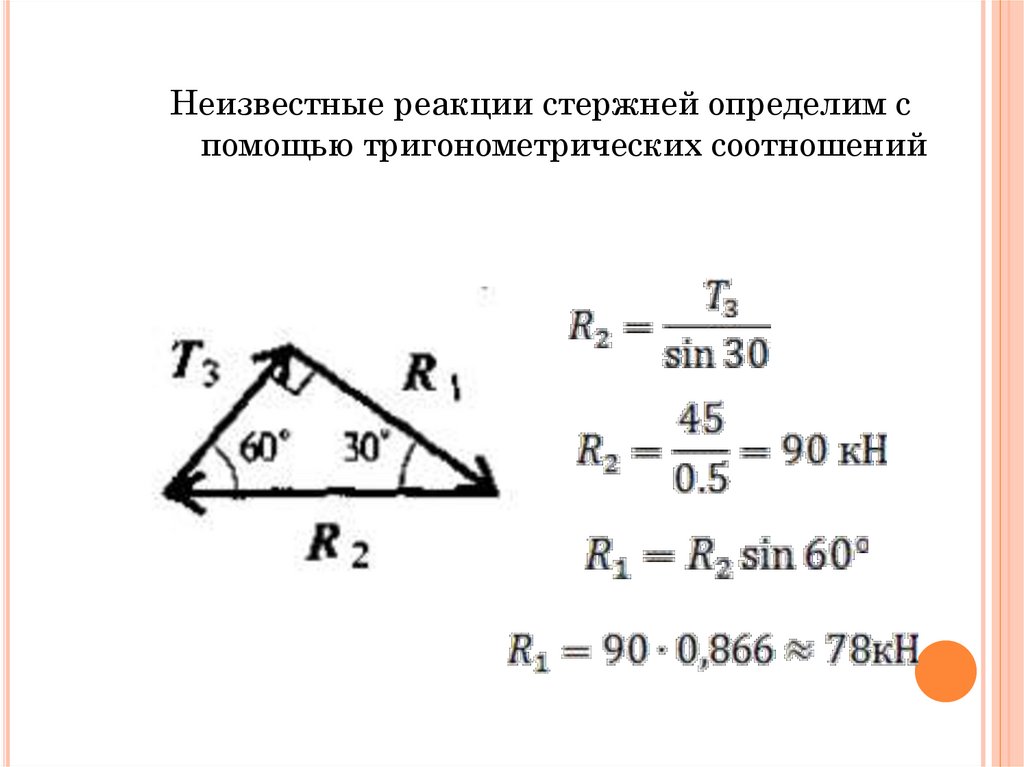 Неизвестные реакции стержней определим спомощью тригонометрических соотношений