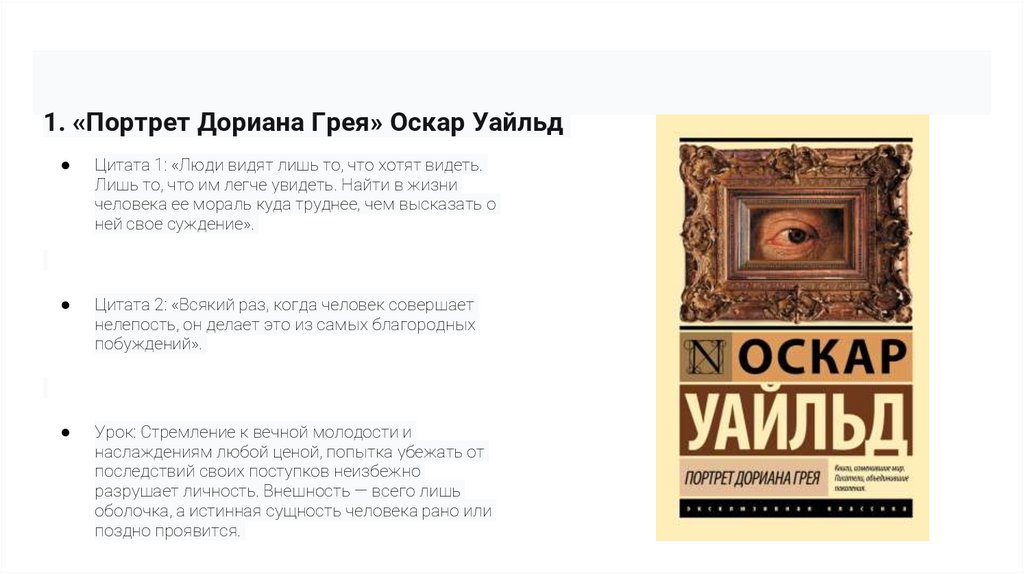 1. «Портрет Дориана Грея» Оскар УайльдЦитата 1: «Люди видят лишь то, что хотят видеть.