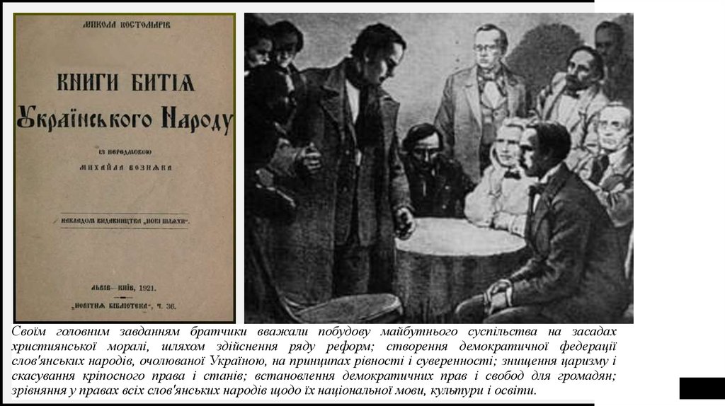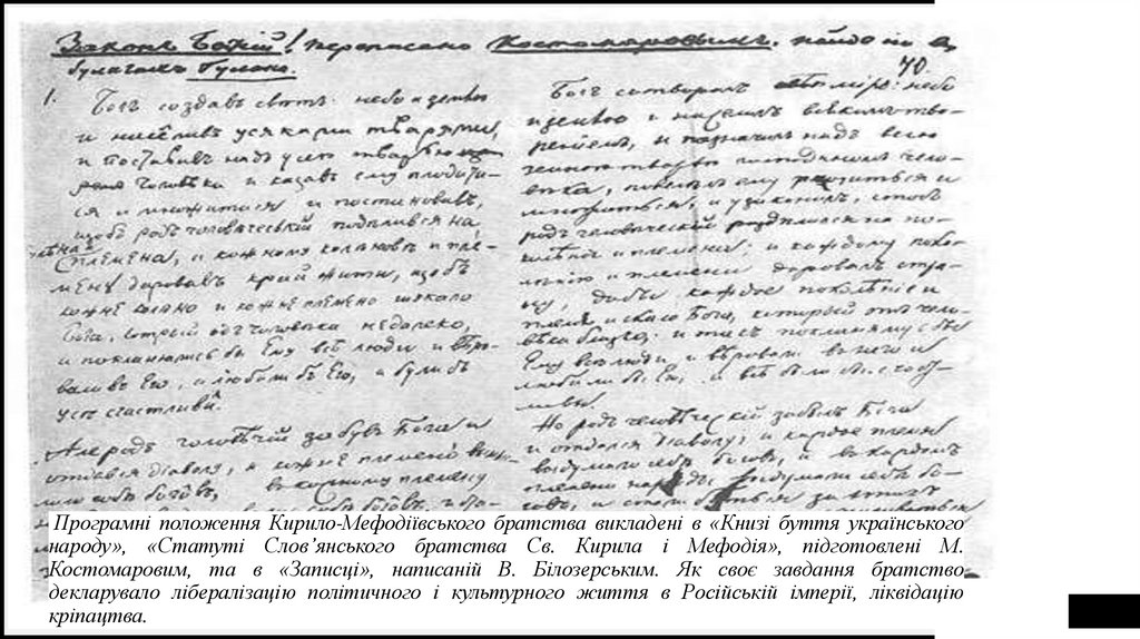 Програмні положення Кирило-Мефодіївського братства викладені в «Книзі буття українськогонароду», «Статуті Слов’янського братства Св. Кирила і Мефодія», підготовлені М.