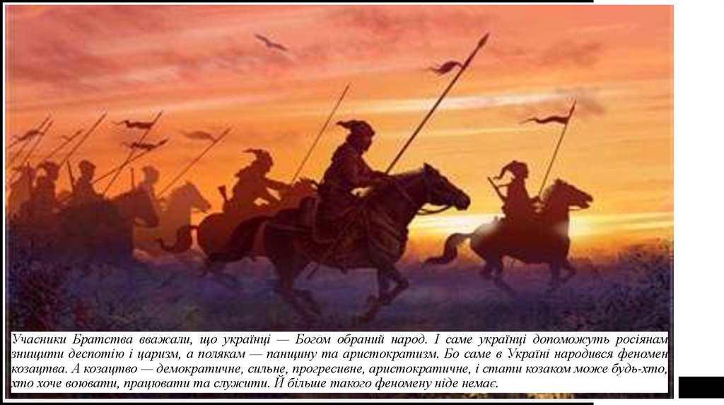 Учасники Братства вважали, що українці — Богом обраний народ. І саме українці допоможуть росіянамзнищити деспотію і царизм, а полякам — панщину та аристократизм. Бо саме в Україні народився феномен