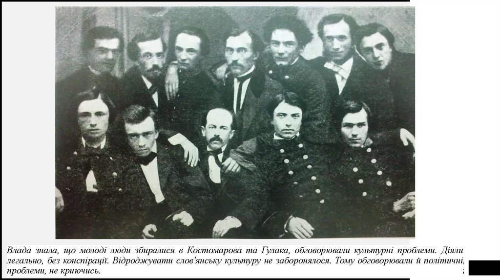 Влада знала, що молоді люди збиралися в Костомарова та Гулака, обговорювали культурні проблеми. Діялилегально, без конспірації. Відроджувати слов'янську культуру не заборонялося. Тому обговорювали й політичні