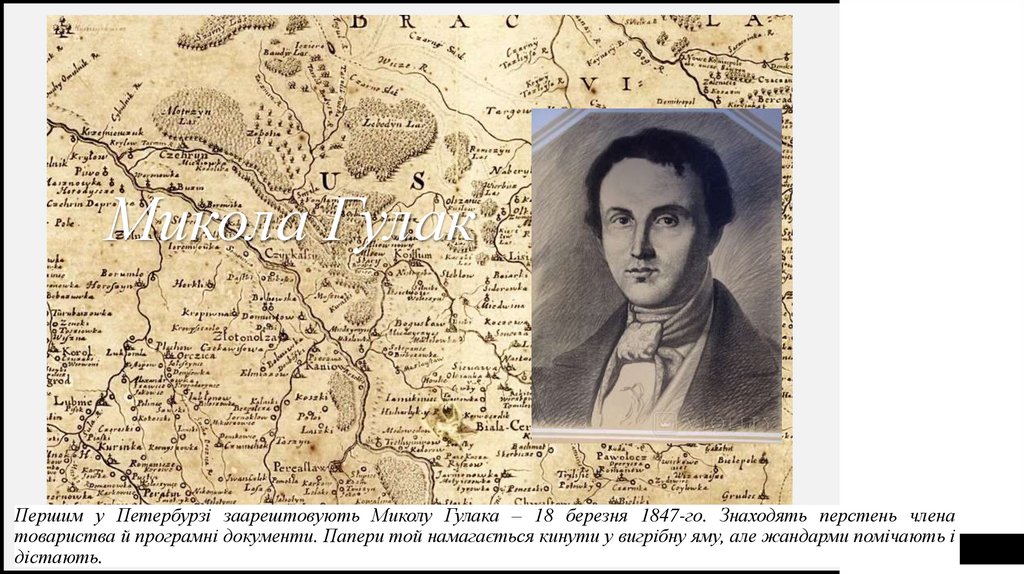 Микола ГулакПершим у Петербурзі заарештовують Миколу Гулака – 18 березня 1847-го. Знаходять перстень члена