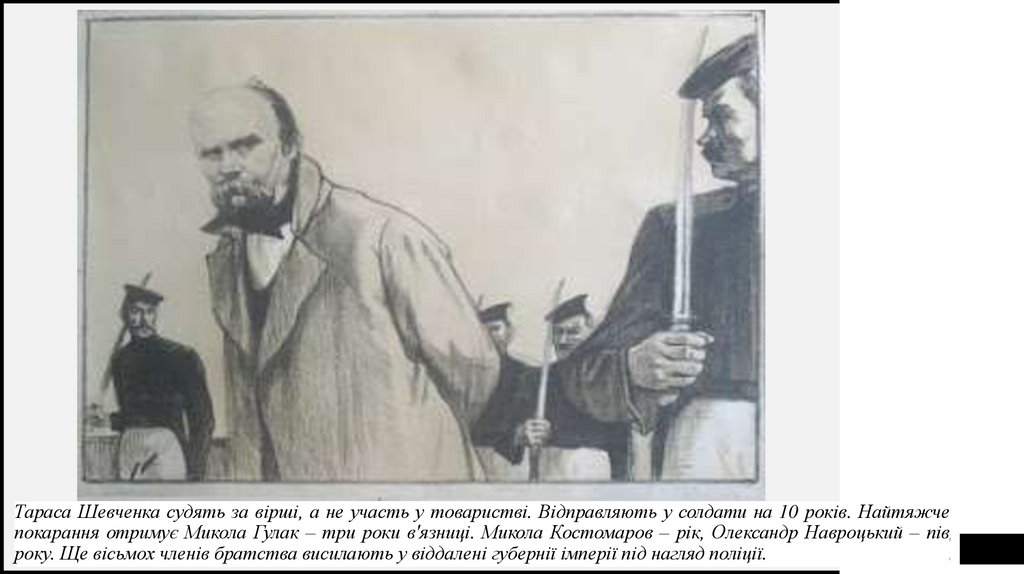 Тараса Шевченка судять за вірші, а не участь у товаристві. Відправляють у солдати на 10 років. Найтяжчепокарання отримує Микола Гулак – три роки в'язниці. Микола Костомаров – рік, Олександр Навроцький
