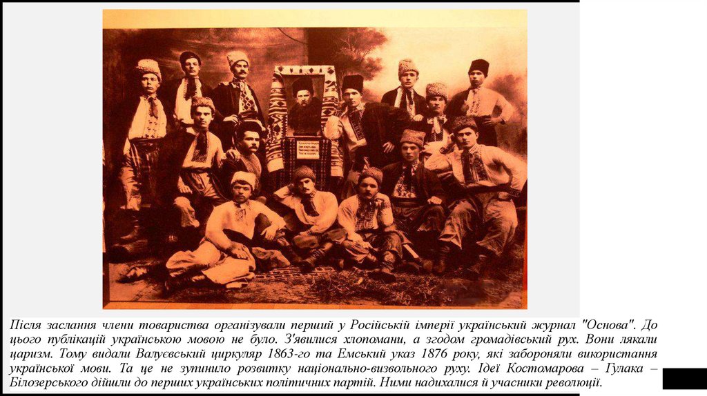 Після заслання члени товариства організували перший у Російській імперії український журнал "Основа". Доцього публікацій українською мовою не було. З'явилися хлопомани, а згодом громадівський рух. Вони лякали