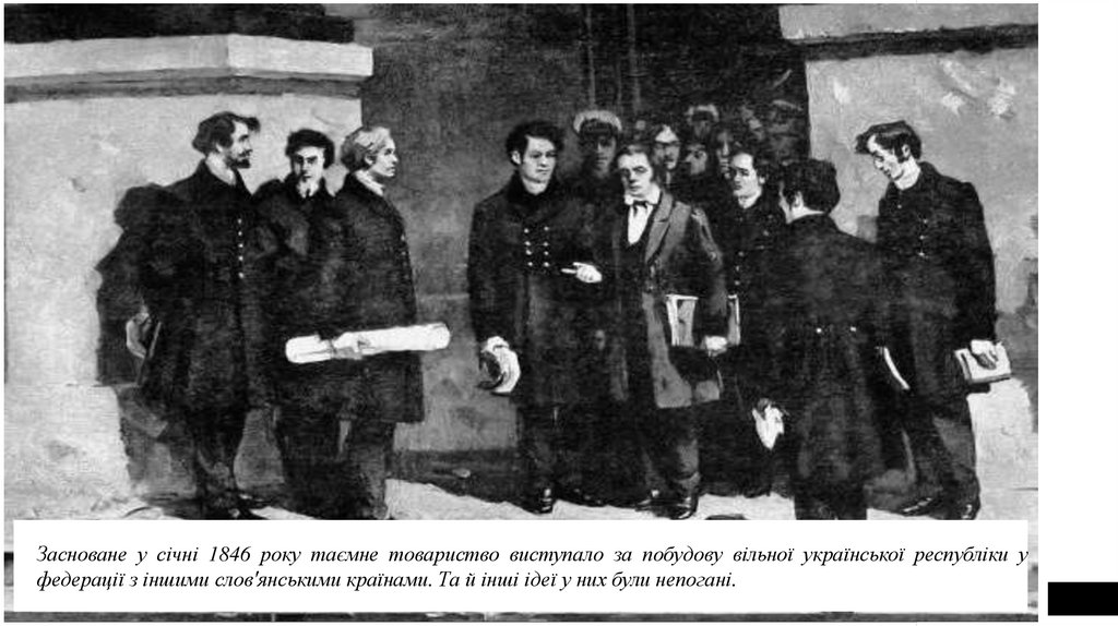 Засноване у січні 1846 року таємне товариство виступало за побудову вільної української республіки уфедерації з іншими слов'янськими країнами. Та й інші ідеї у них були непогані.