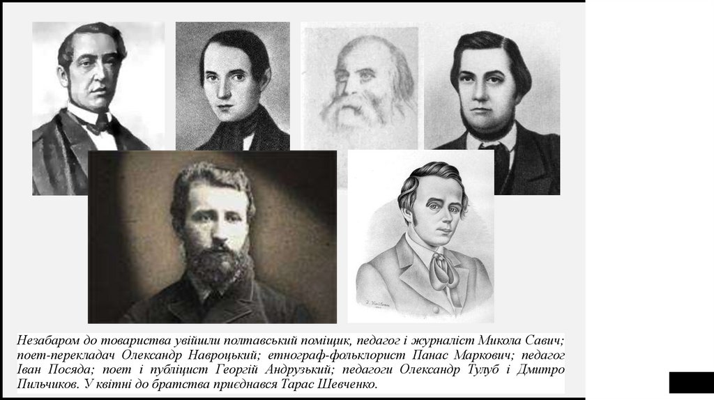 Незабаром до товариства увійшли полтавський поміщик, педагог і журналіст Микола Савич;поет-перекладач Олександр Навроцький; етнограф-фольклорист Панас Маркович; педагог