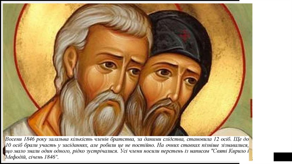 що мало знали один одного, рідко зустрічалися. Усі члени носили перстень із написом "Святі Кирило і