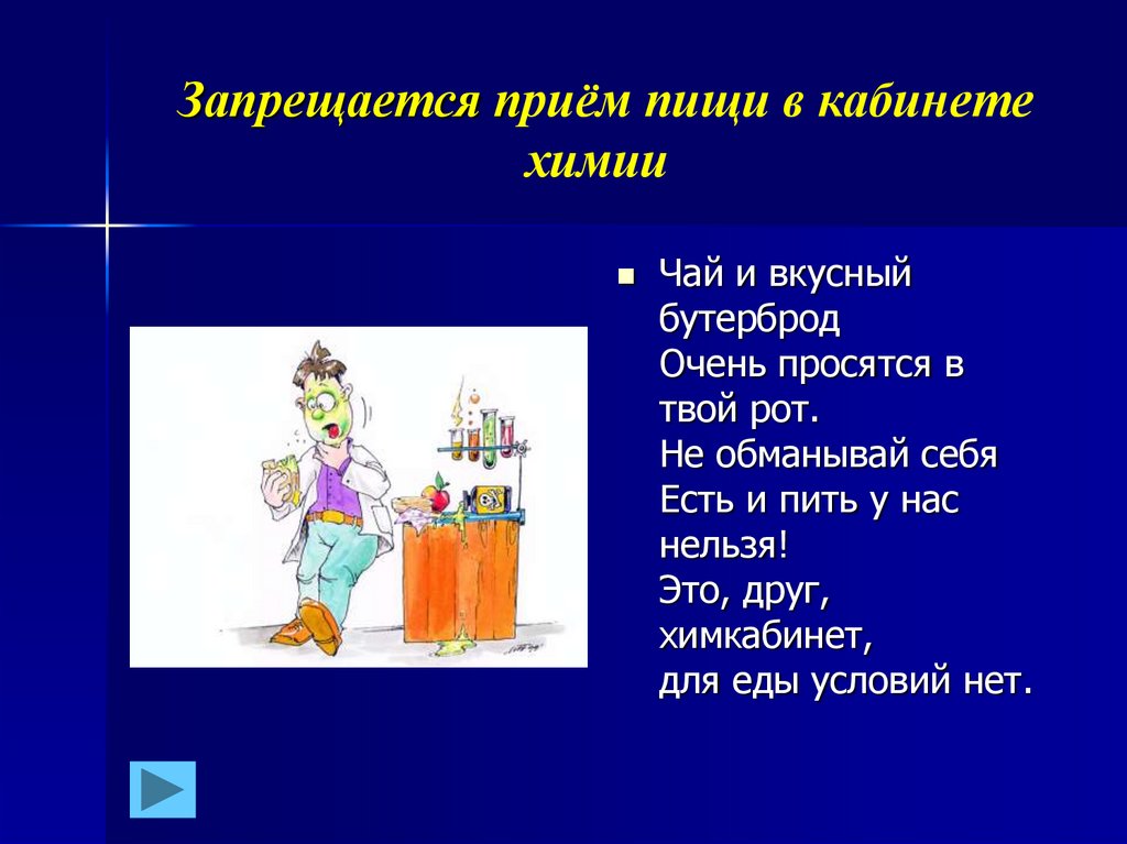 Запрещается приём пищи в кабинетехимии
