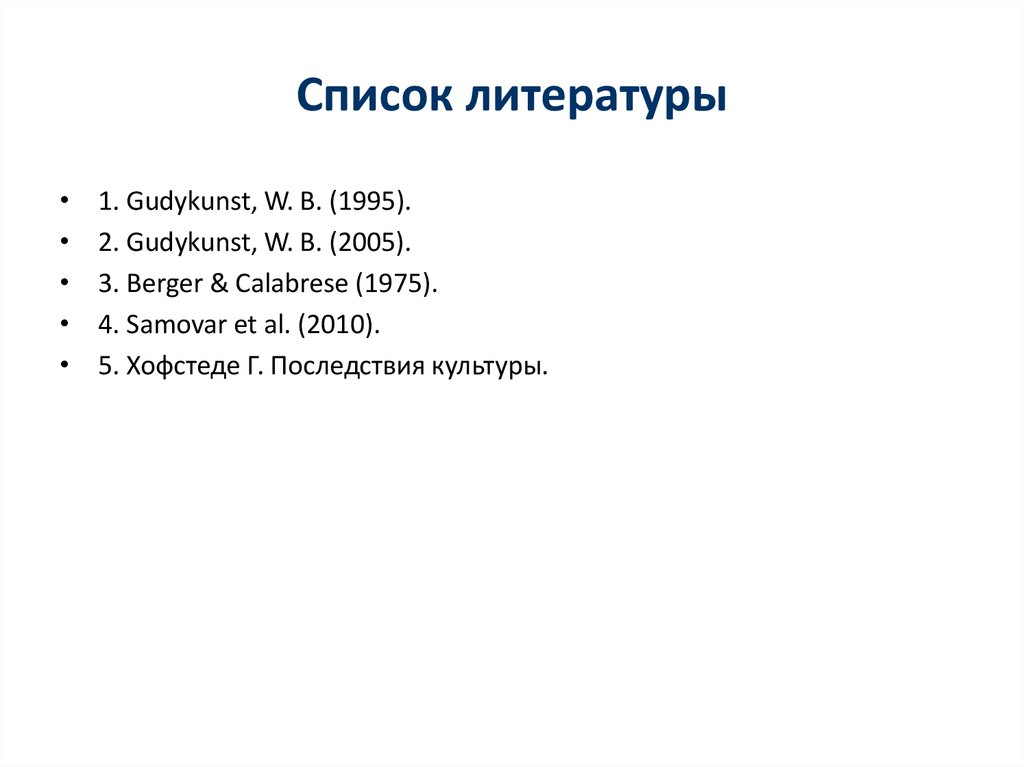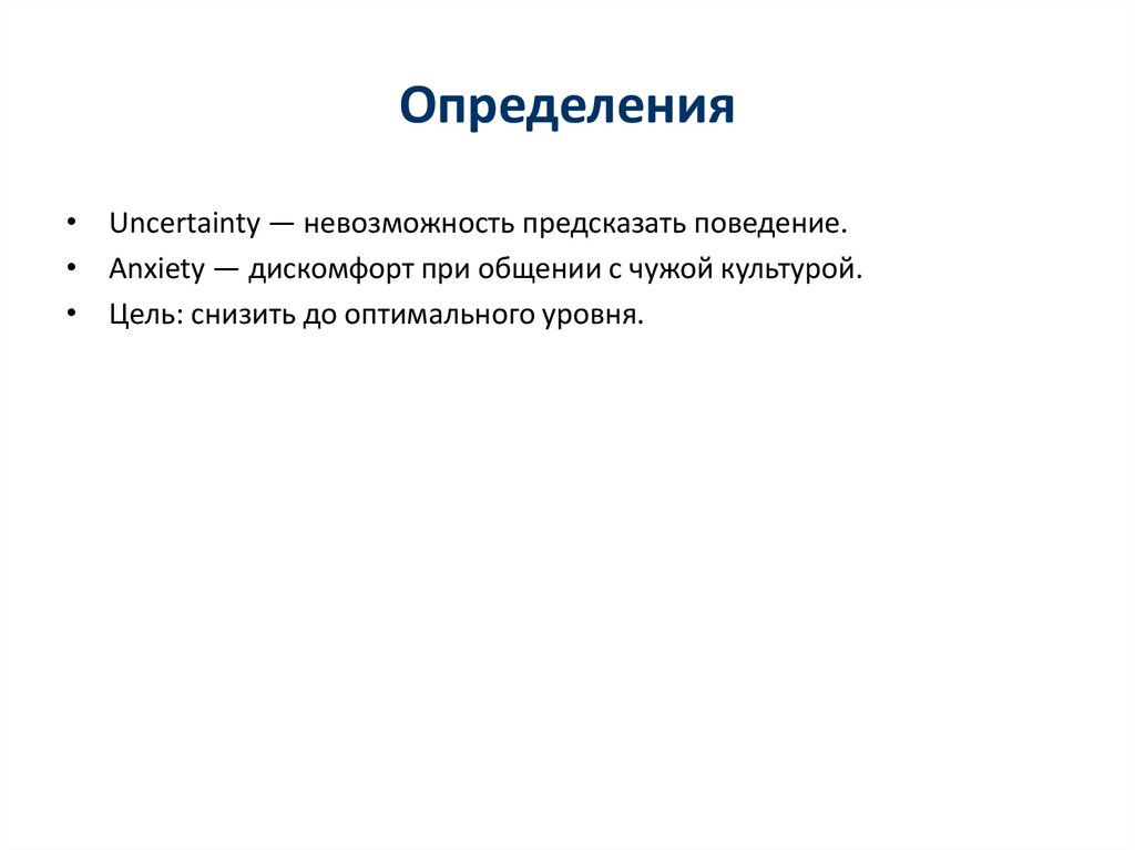 • Anxiety — дискомфорт при общении с чужой культурой.