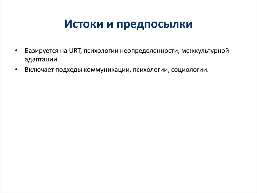 Истоки и предпосылки• Базируется на URT, психологии неопределенности, межкультурной