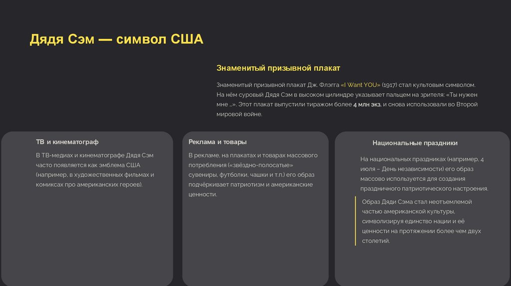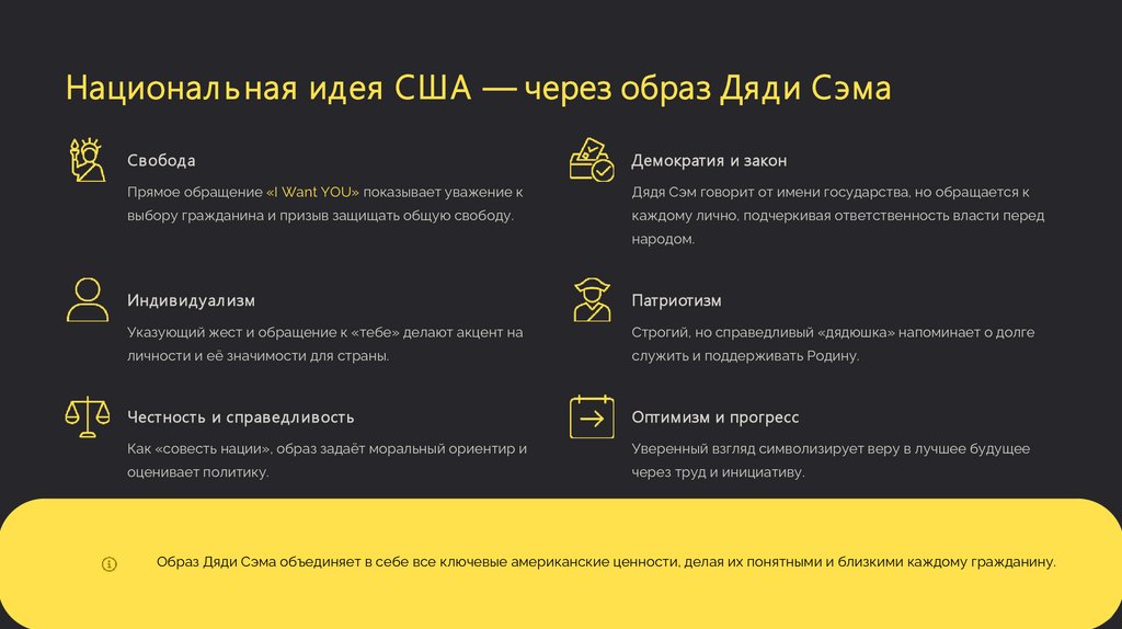 Образ Дяди Сэма объединяет в себе все ключевые американские ценности, делая их понятными и близкими каждому гражданину.
