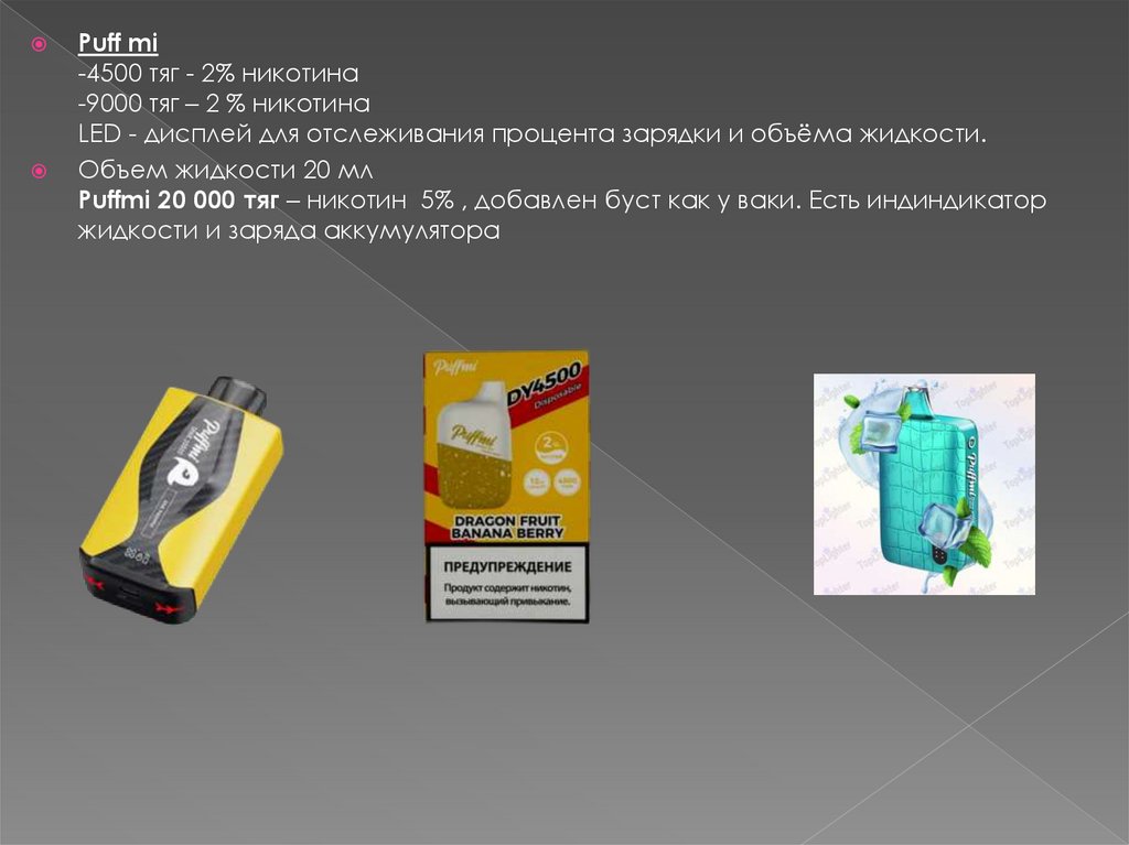 Puffmi 20 000 тяг – никотин 5% , добавлен буст как у ваки. Есть индиндикатор