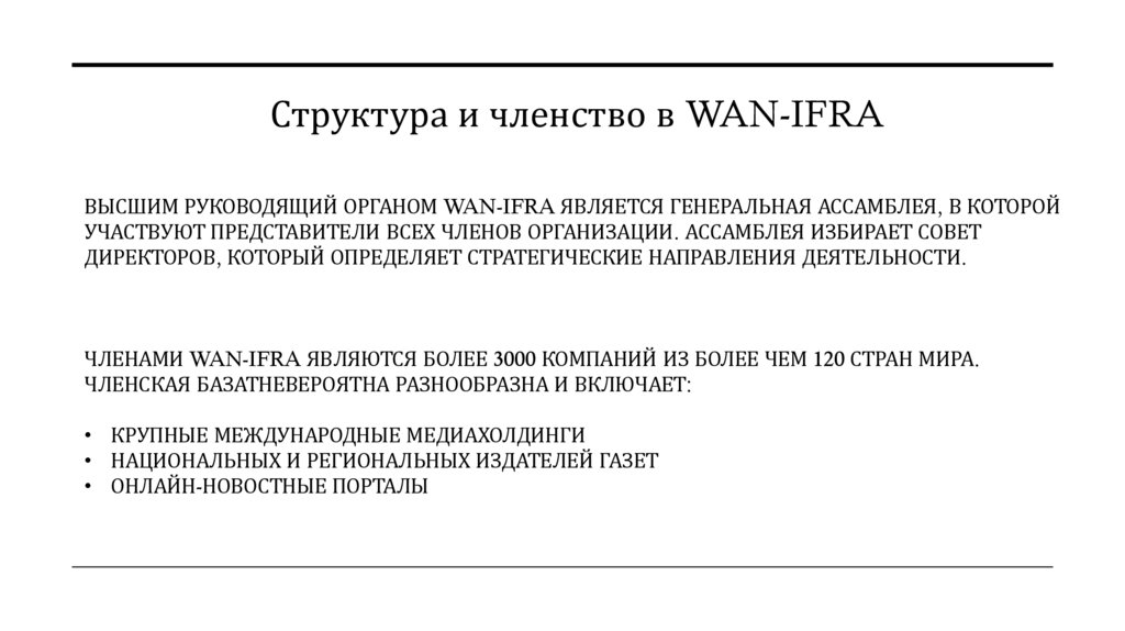 Структура и членство в WAN-IFRAВЫСШИМ РУКОВОДЯЩИЙ ОРГАНОМ WAN-IFRA ЯВЛЯЕТСЯ ГЕНЕРАЛЬНАЯ АССАМБЛЕЯ, В КОТОРОЙ