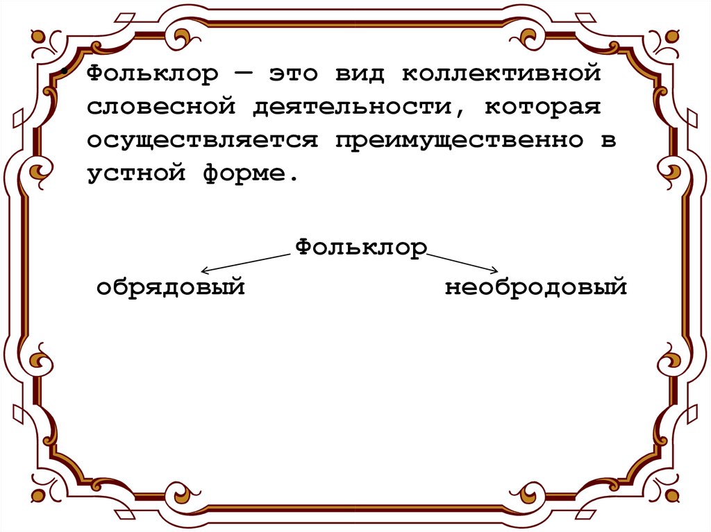 • Фольклор — это вид коллективнойсловесной деятельности, которая