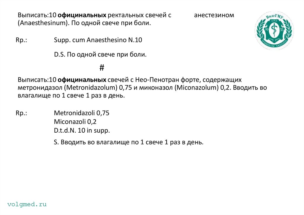 метронидазол (Metronidazolum) 0,75 и миконазол (Miconazolum) 0,2. Вводить во