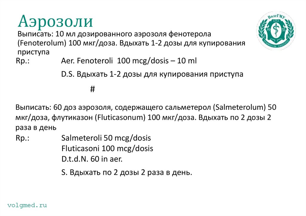 Выписать: 60 доз аэрозоля, содержащего сальметерол (Salmeterolum) 50