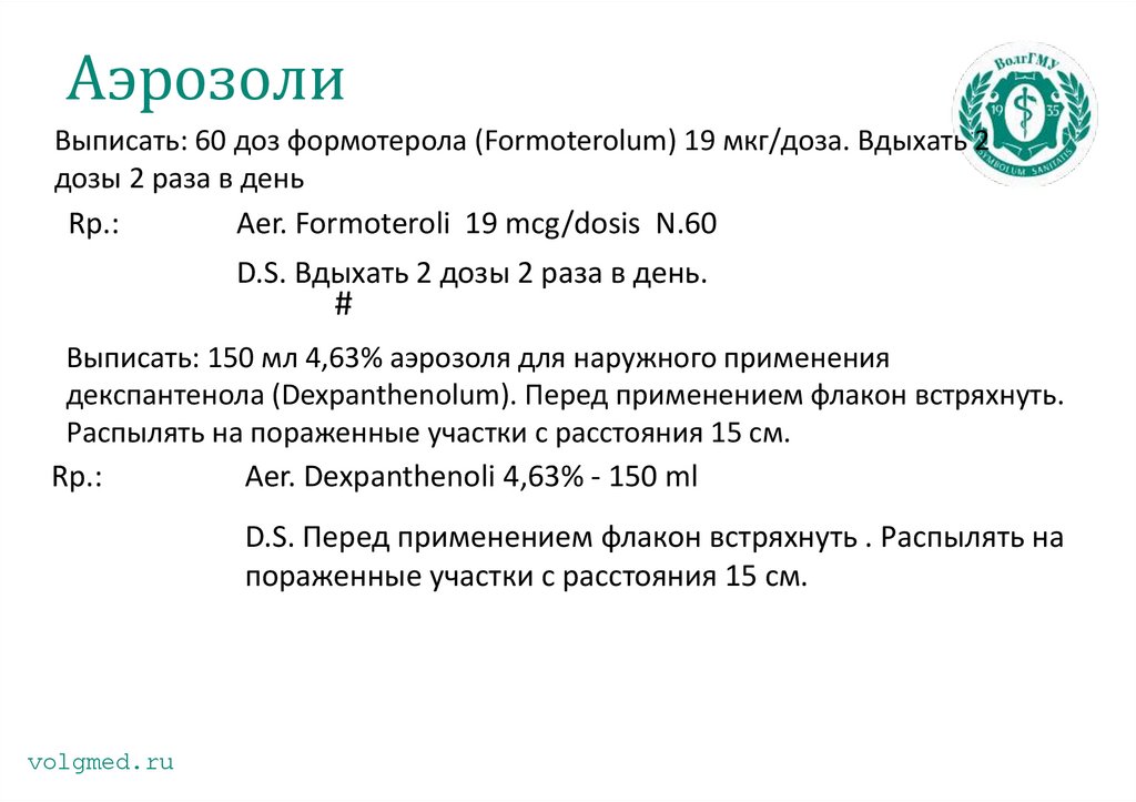 АэрозолиВыписать: 60 доз формотерола (Formoterolum) 19 мкг/доза. Вдыхать 2