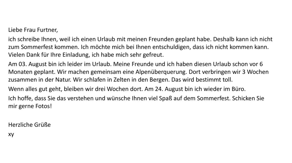Liebe Frau Furtner,ich schreibe Ihnen, weil ich einen Urlaub mit meinen Freunden geplant habe. Deshalb kann ich nicht