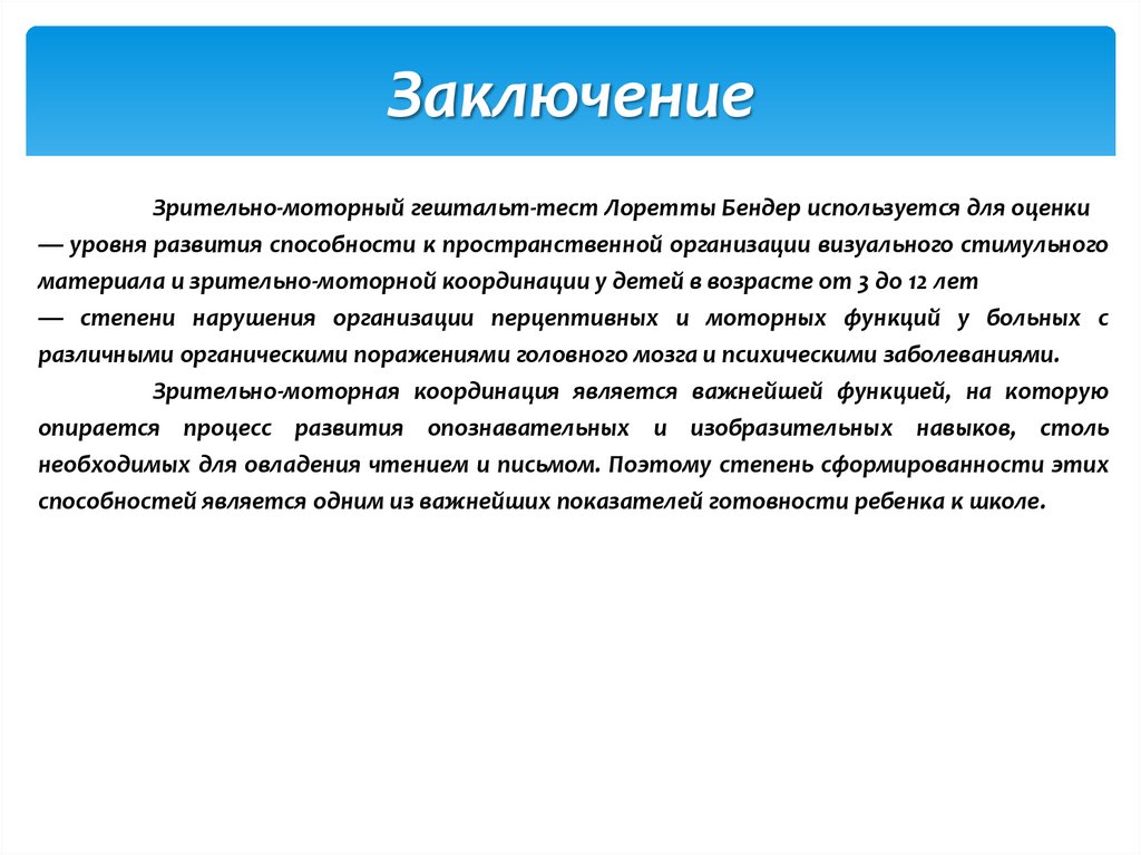 ЗаключениеЗрительно-моторный гештальт-тест Лоретты Бендер используется для оценки