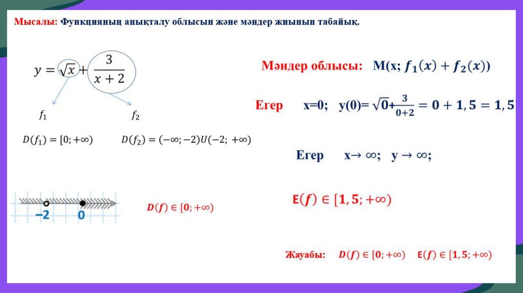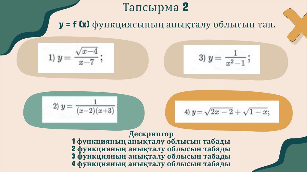 Тапсырма 2y = f (x) функциясының анықталу облысын тап.