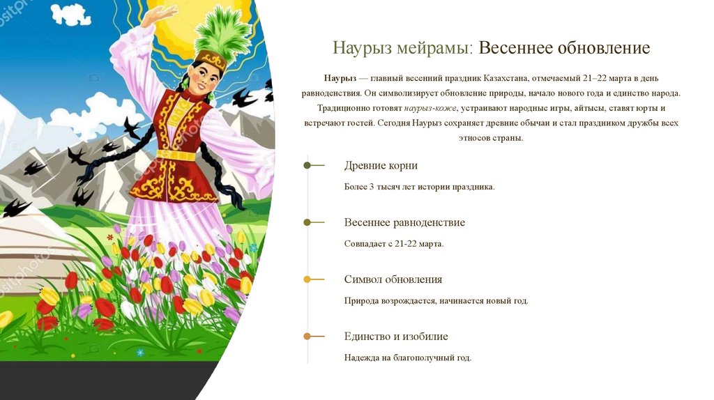 Наурыз мейрамы: Весеннее обновлениеНаурыз — главный весенний праздник Казахстана, отмечаемый 21–22 марта в день