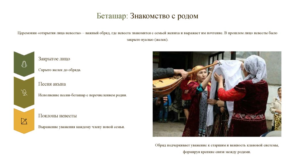 Беташар: Знакомство с родомЦеремония «открытия лица невесты» – важный обряд, где невеста знакомится с семьей жениха и выражает им почтение. В прошлом лицо невесты было