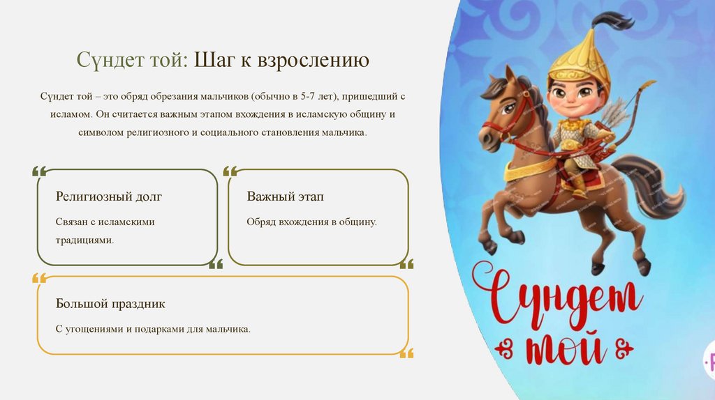 Сүндет той: Шаг к взрослениюСүндет той – это обряд обрезания мальчиков (обычно в 5-7 лет), пришедший с